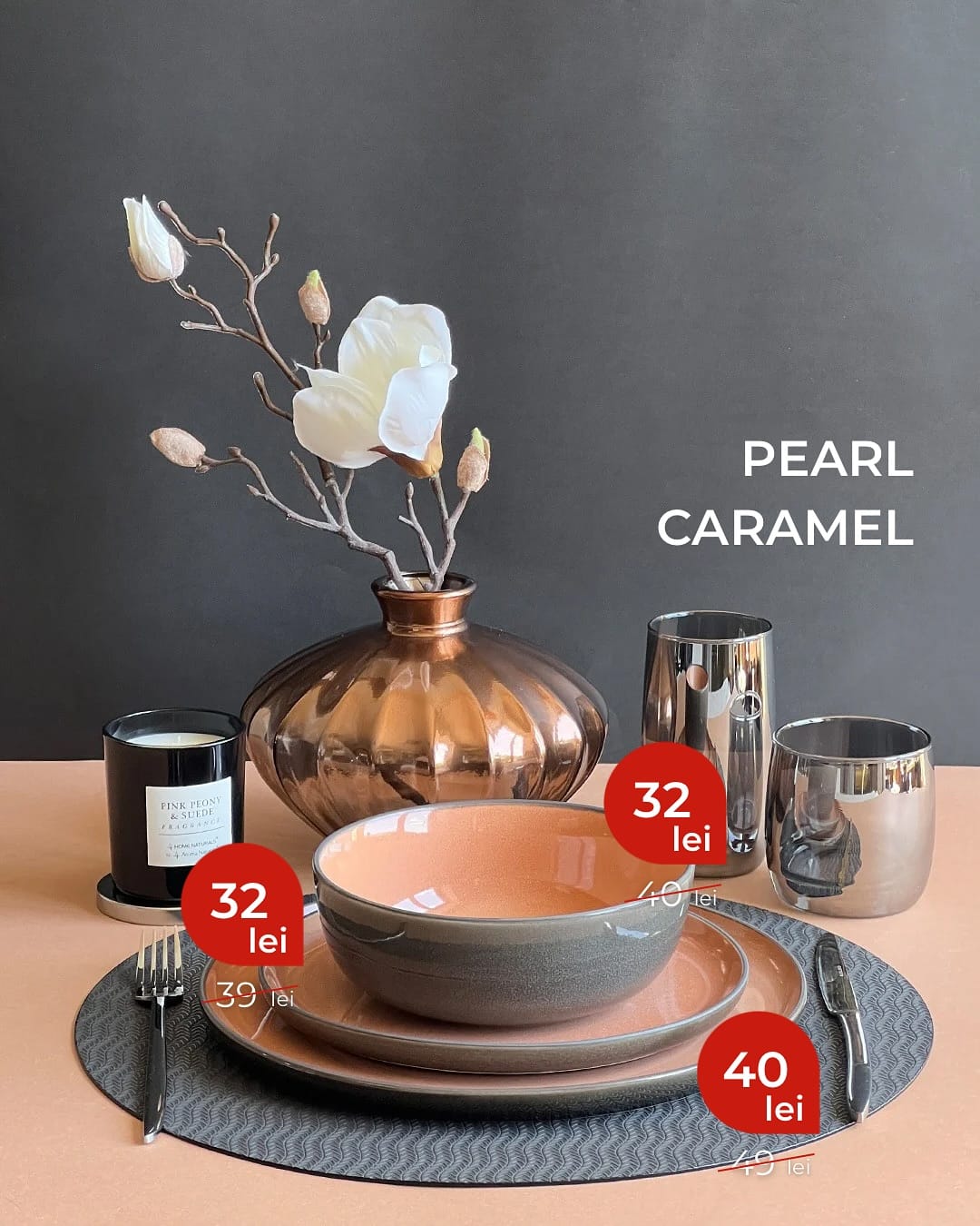 PEARL CARAMEL plate set with knife and fork