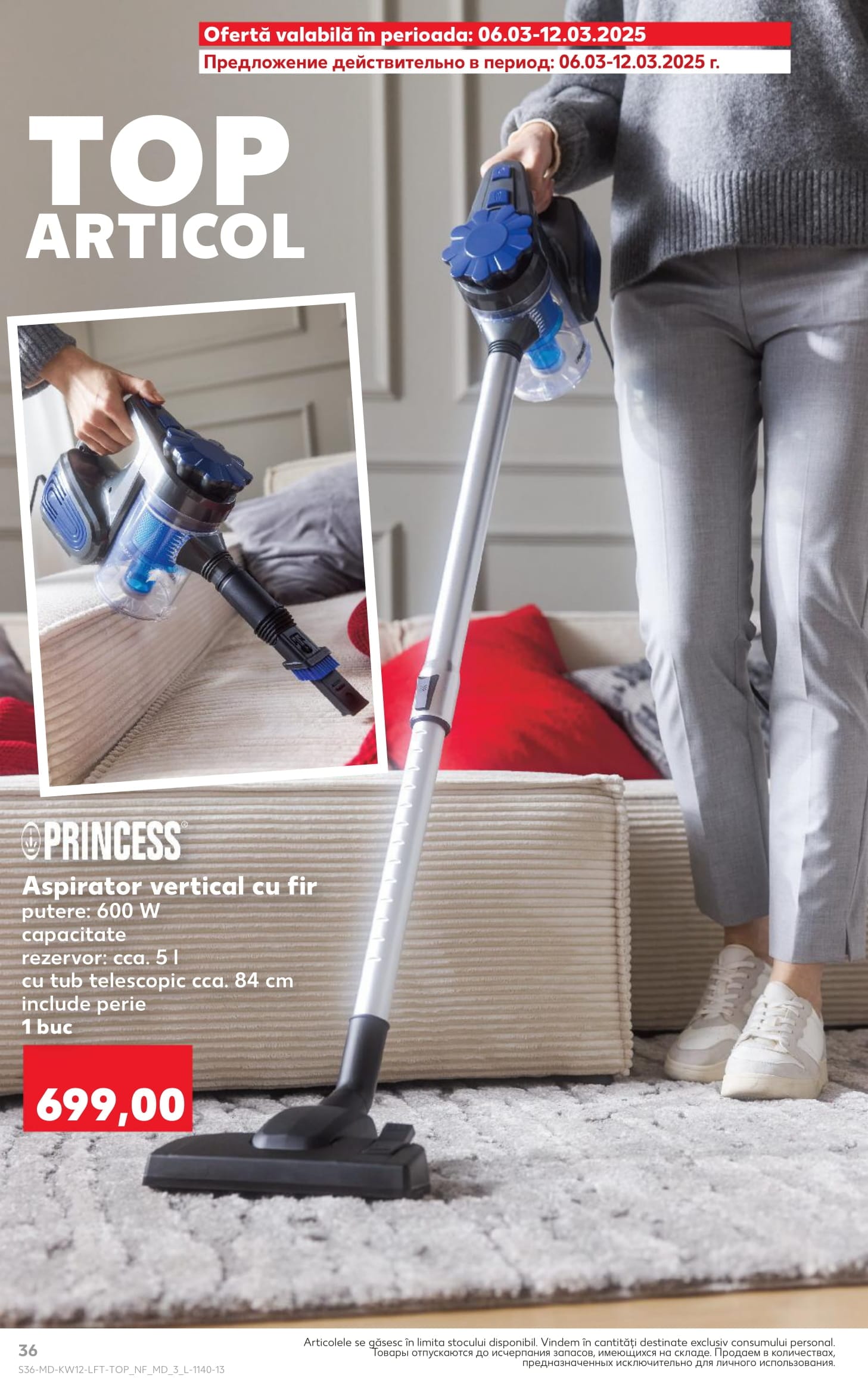 PRINCESS Aspirator vertical cu fir putere 600 W capacitate rezervor cca 5 l cu tub telescopic cca 84 cm include perie 1 buc