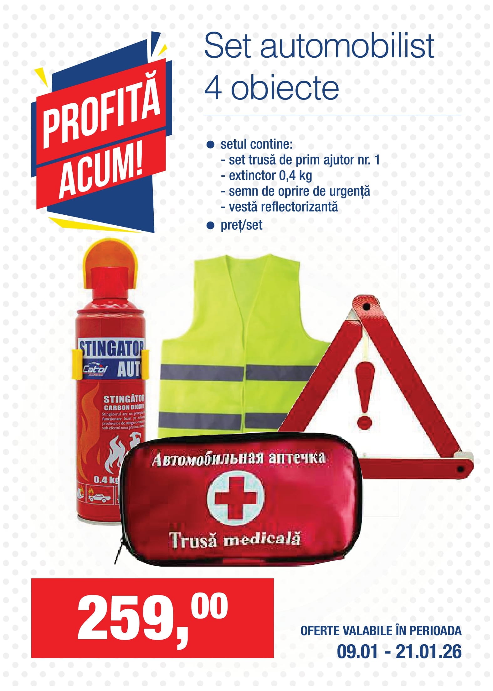 Set automobilist 4 obiecte set trusă de prim ajutor, extinctor 0.4 kg, semn de oprire, vestă reflectorizantă